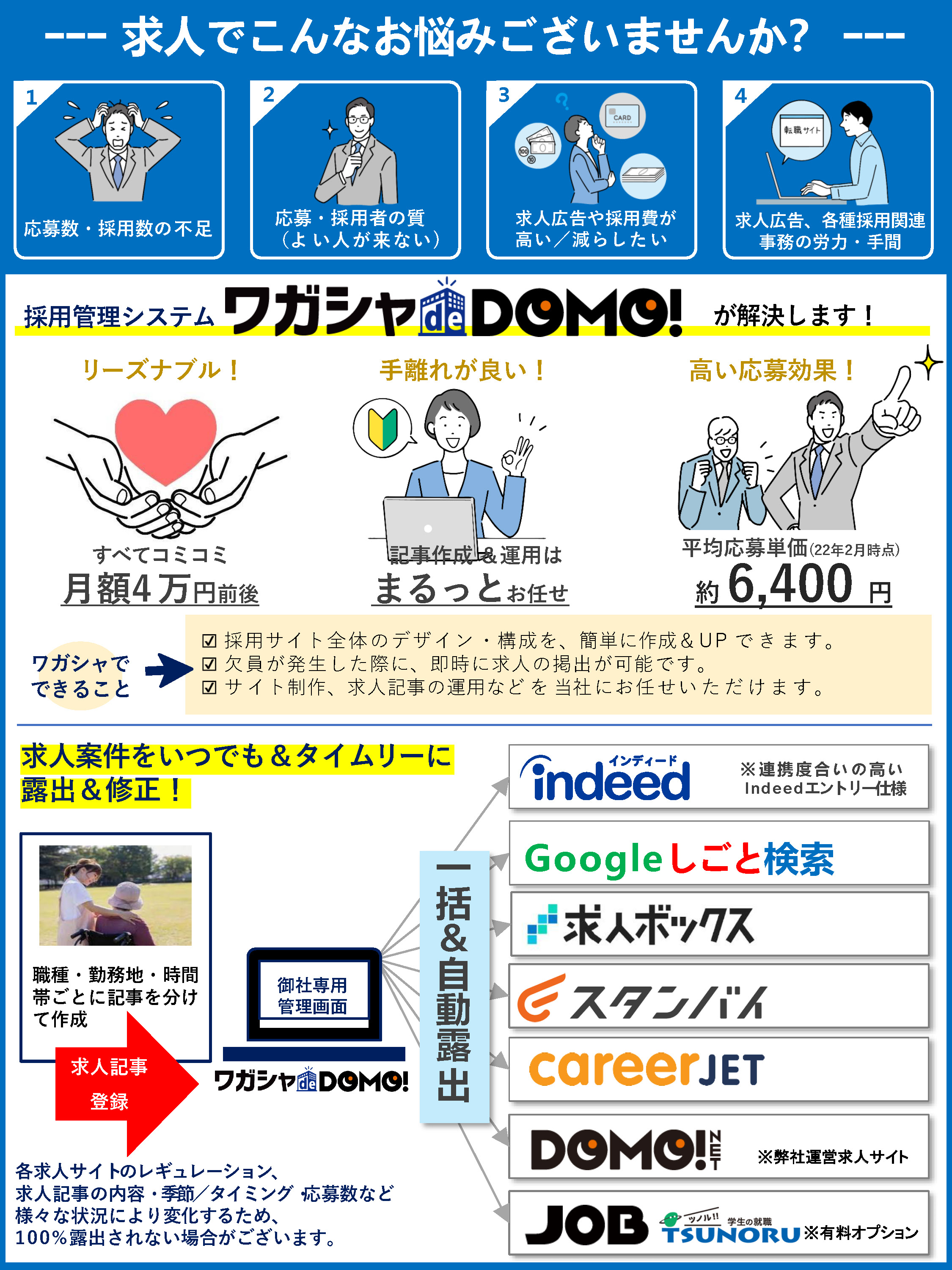 作成した求人ページは、『DOMO NET』や『Indeed』にも掲載されます。
